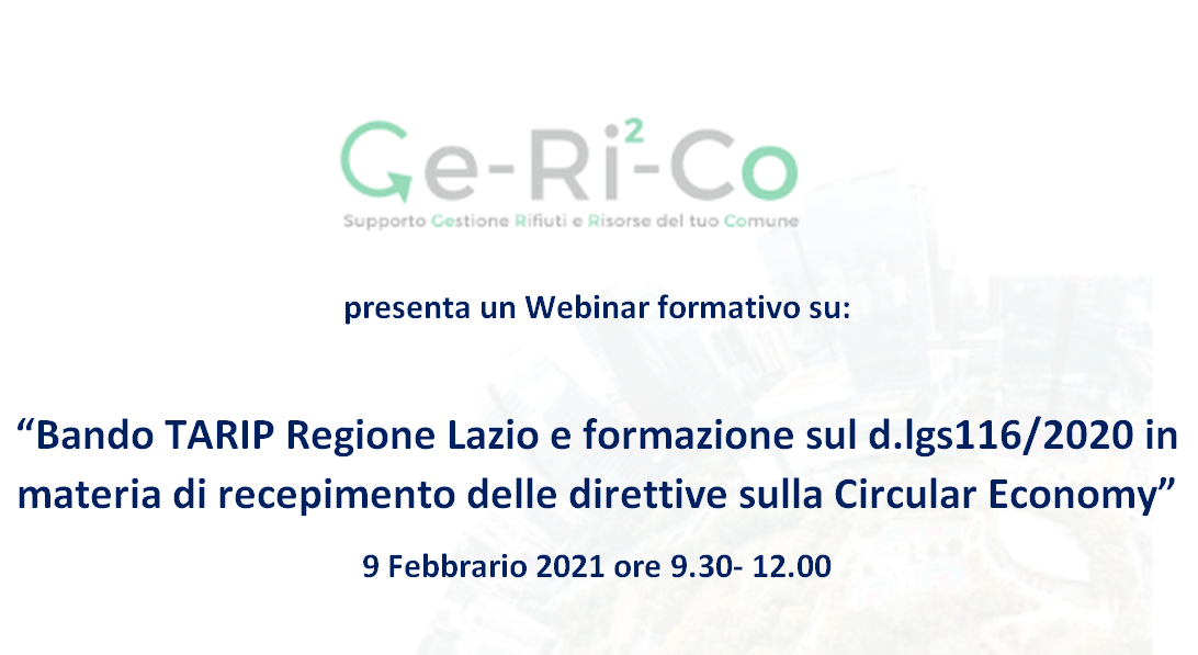 “BANDO TARIP REGIONE LAZIO E FORMAZIONE SUL D.LGS116/2020 IN MATERIA DI RECEPIMENTO DELLE DIRETTIVE SULLA CIRCULAR ECONOMY” E' IL TITOLO DEL PRIMO DI UNA SERIE DI WEBINAR FORMATIVI MESSI IN CAMPO PER I COMUNI DEL LAZIO